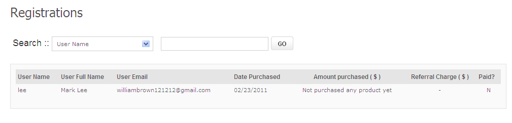 To view all the users referred by you click ' Registrations ' on top affiliate menu section.In the ensuing screen you can view the referred users along with their purchase amount,referral charge etc.The users will be listed only when they purchase with {SITE_NAME}.